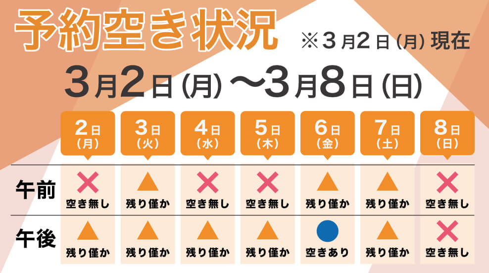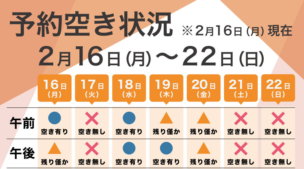 現在「空きなし」と表示されている日時でも、当日のキャンセルや時間調整によりご案内できる場合がございます。お急ぎの症状がある方は、まずはお電話またはWEB・LINEよりお問い合わせください。
