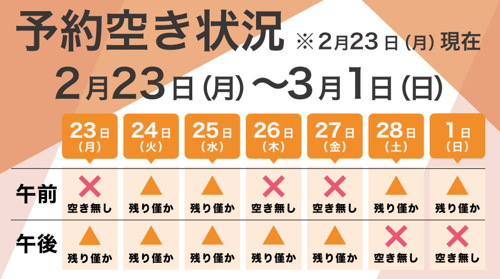 札幌市西区西野の歯科・歯医者「スマイルオフィスデンタルクリニック西野」の2月23日(月)〜3月1日(日)の予約状況をお知らせいたします。